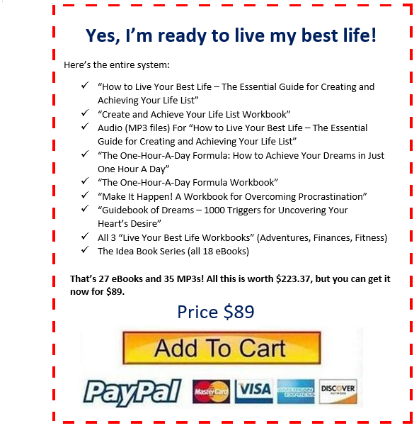 The "Idea Book" series contains ideas for every life area, including travel, adventure, finances, fitness, sports, education, lifestyle, spirituality, contributions, hobbies, and more. You'll receive the entire series--all 18 eBooks--as part of the "How to Live Your Best Life" system.(Read more.)